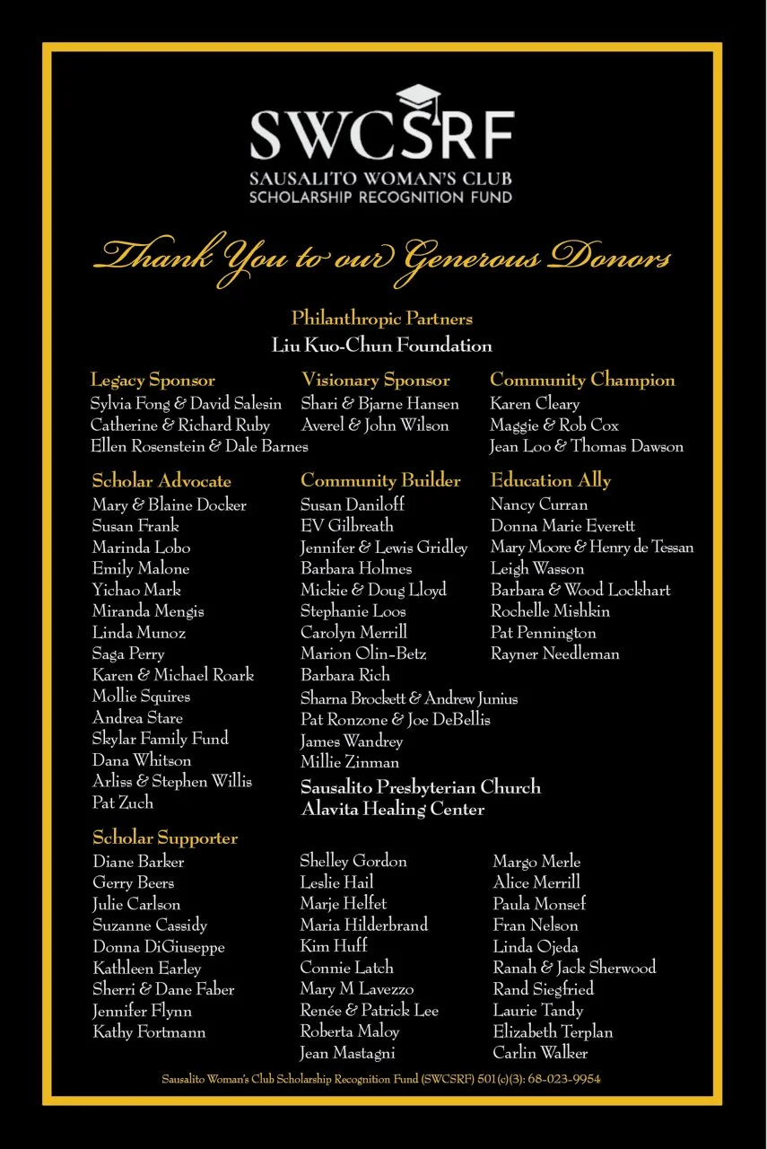 Since 1956, the Sausalito Woman’s Club Scholarship Recognition Fund (SWCSRF) has helped students from Sausalito and Marin City pursue their college and career dreams. Each year, deserving local scholars are recognized and supported through meaningful awards—in 2025 alone, 42 scholarships were granted, including 22 Named Scholarships.